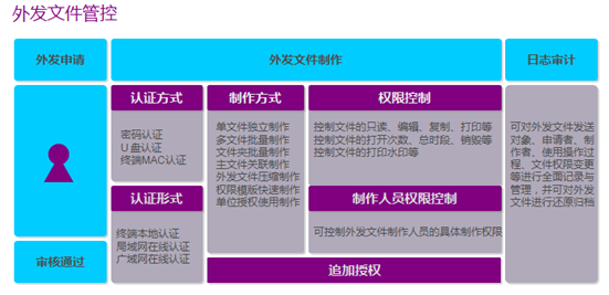 (五)移动智能终端 多平台、全面移动安全。DLP数据泄露防护领域延伸至IPAD、IPHONE以及 Android、Mobile移动智能终端,实现身份安全管理、终端安全接入、数据安全传输、数据安全访问以及数据安全存储全面安全防护。 (六)外发文件控制 多场景、全方位外发文件安全。 DLP 数据泄露防护领域延伸至发送给客户/合作伙伴单人或多人协作的电子文档,实现对外发文件的外发审核、加密制作权限、日志审核以及用户身份与权限认证等全方位安全防护。